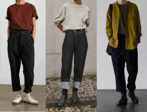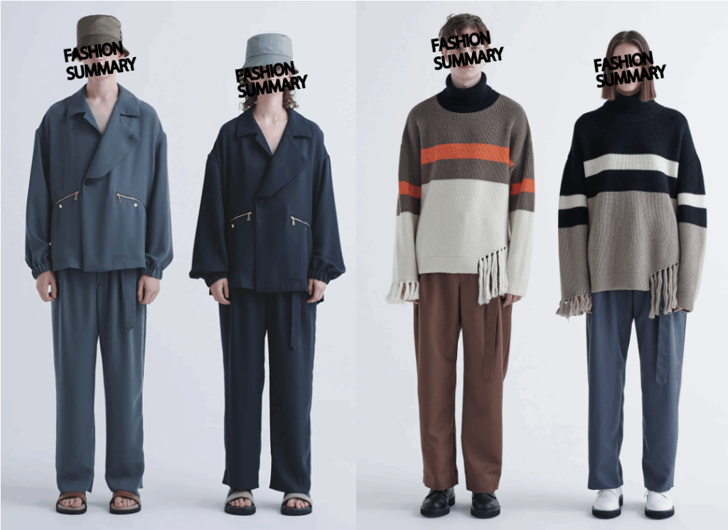 - オーバーサイズのシャツやワイドパンツなど、男女問わず着用できるデザイン。